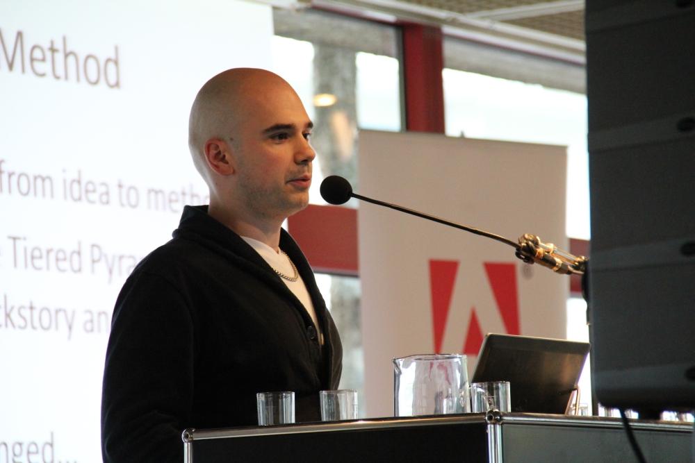 Doru Apreotesei ist Crea­ti­ve Su­per­vi­sor der Düsseldorfer Spieleschmiede Ubi­soft Blue Byte. Er stellte seine „Tiered Pyramid“-Methode vor, die die Entwicklung von Spielen gegen die Unwegsamkeiten solcher Großprojekte abhärten soll. Statt auf ein ideales, aber eventuell unerreichbares Endprodukt hinzuarbeiten, wird auf autonomen Zwischenprodukten aufgebaut.