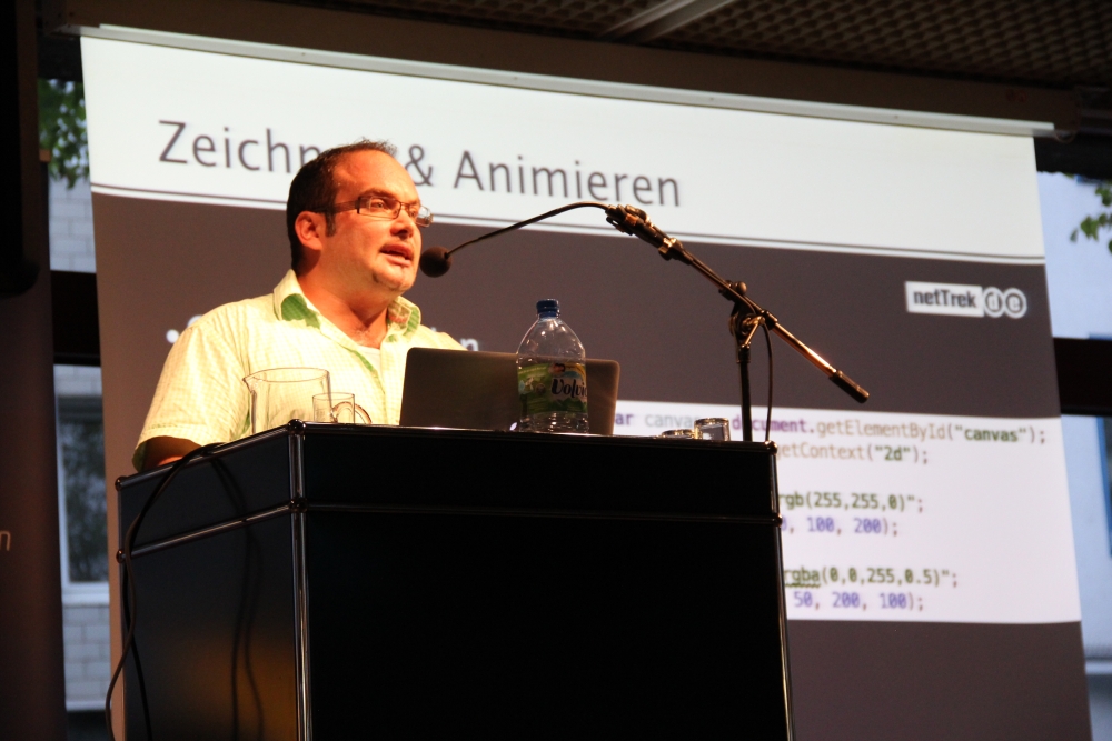 Saban Ünlü ist geschäftsführender Gesellschafter der netTrek GmbH und freier Adobe-Mitarbeiter. Seine Präsentation zeigte, wie man mithilfe der JavaScript-Bibliothek CreateJS effizient und zeitsparend programmieren kann. Dem Publikum zeigte er die Vorteile live im Quellcode.