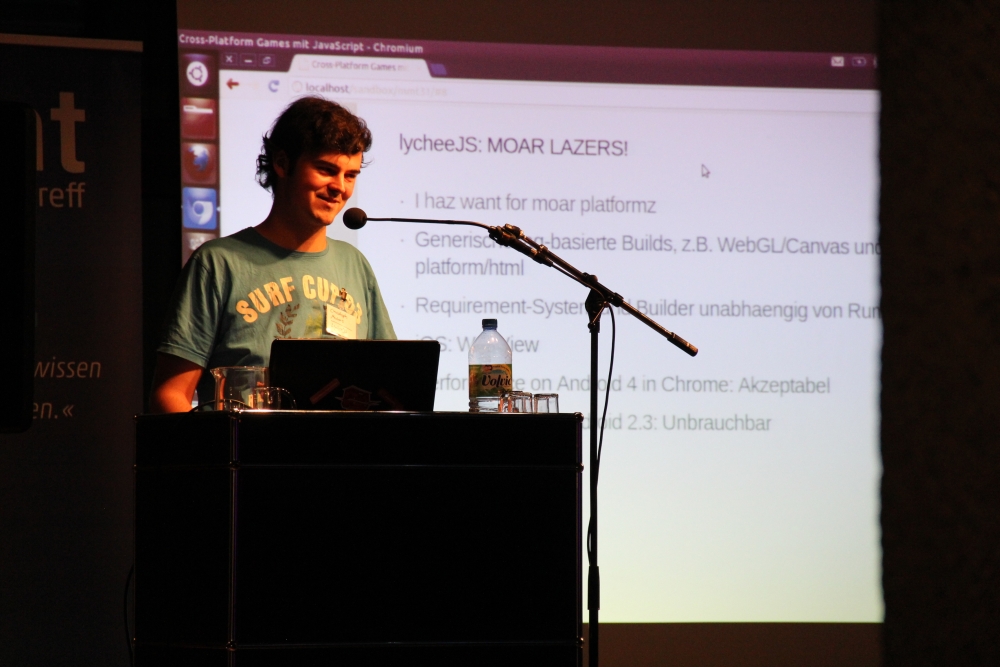 Christoph Marten ist Informatikstudent und war als JavaScript Engineer bei Zynga Germany angestellt. In seinem Vortrag ging es um Cross-Platform Games mit JavaScript, HTML5, WebGL und OpenGL.