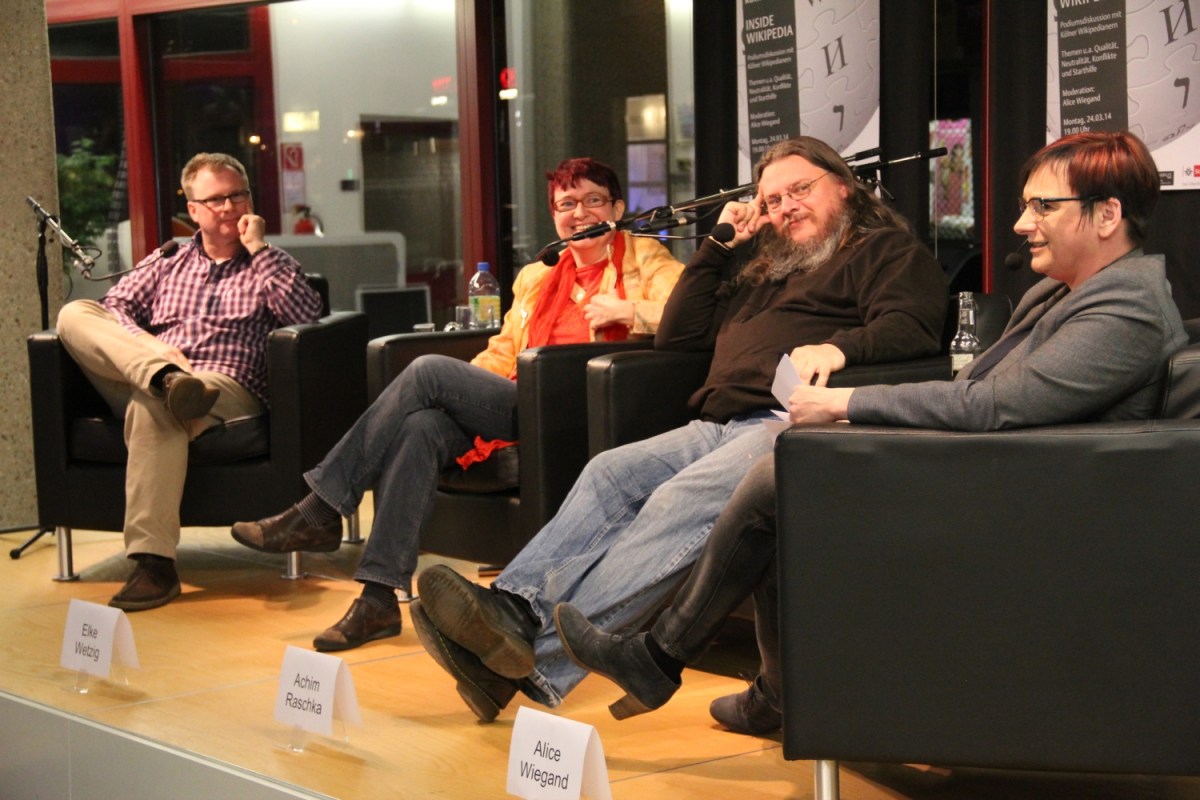 Das Panel Veröffentlicht 26. März 2014 in 1500 × 1000 in Das war „Inside Wikipedia“: Zwischen „Pipistrellus raceyi“ und „Ficken“ ← Zurück Weiter → Von links nach rechts: Robert Schlappal, Elke Wetzig, Achim Raschka und Alice Wiegand.